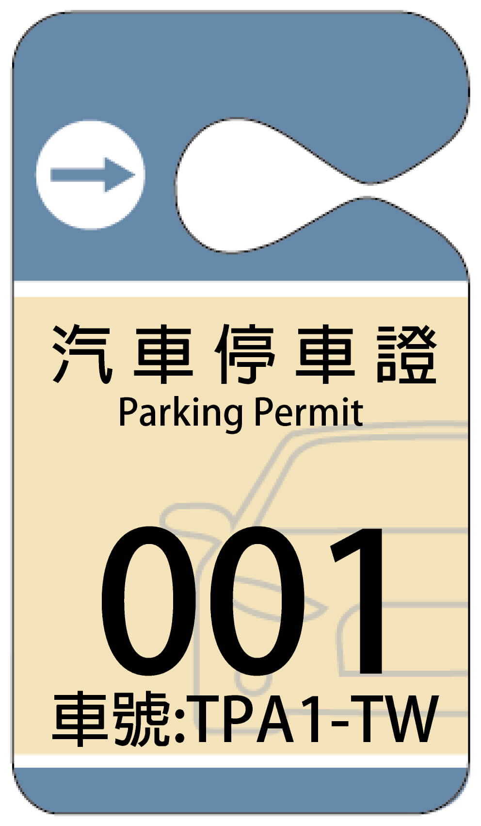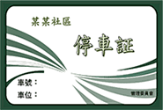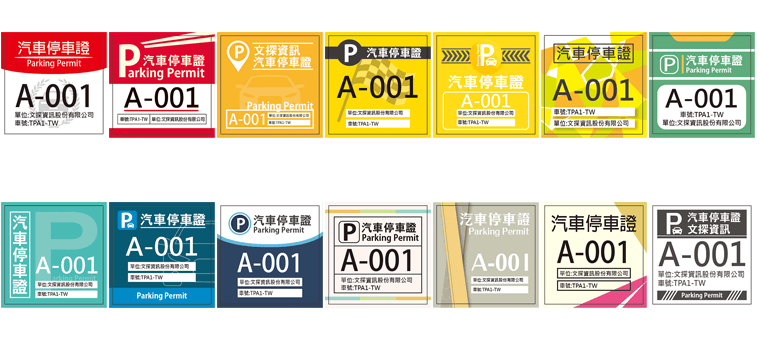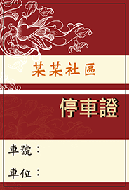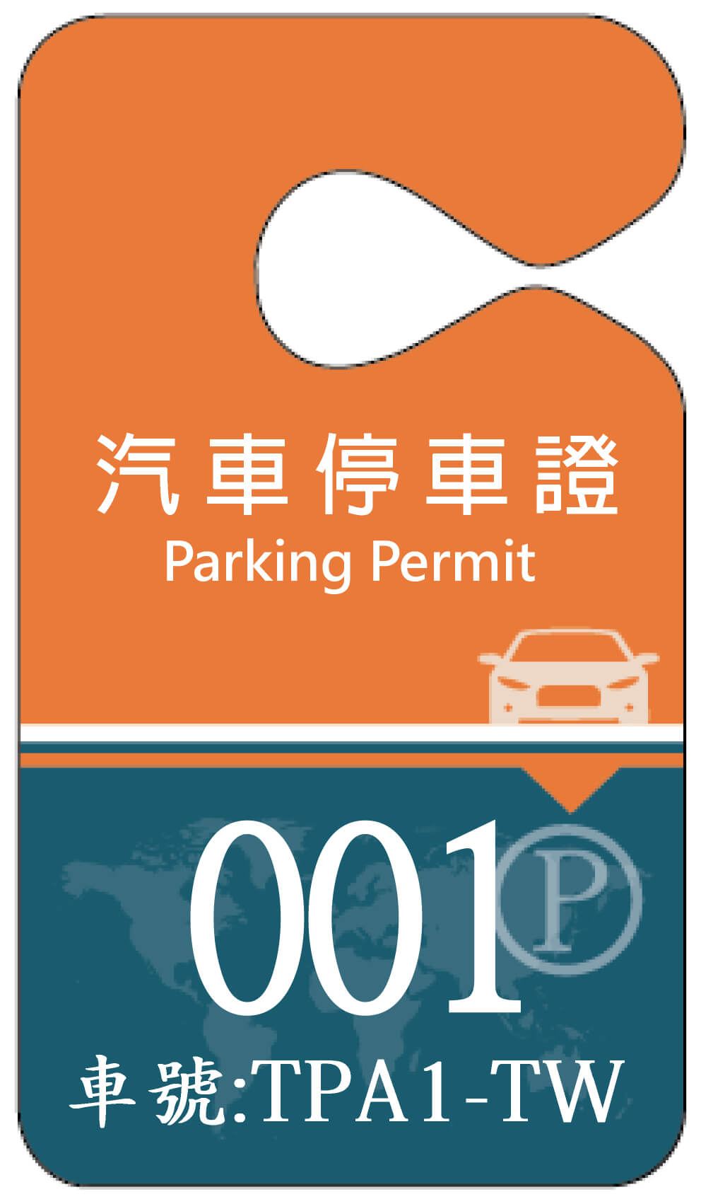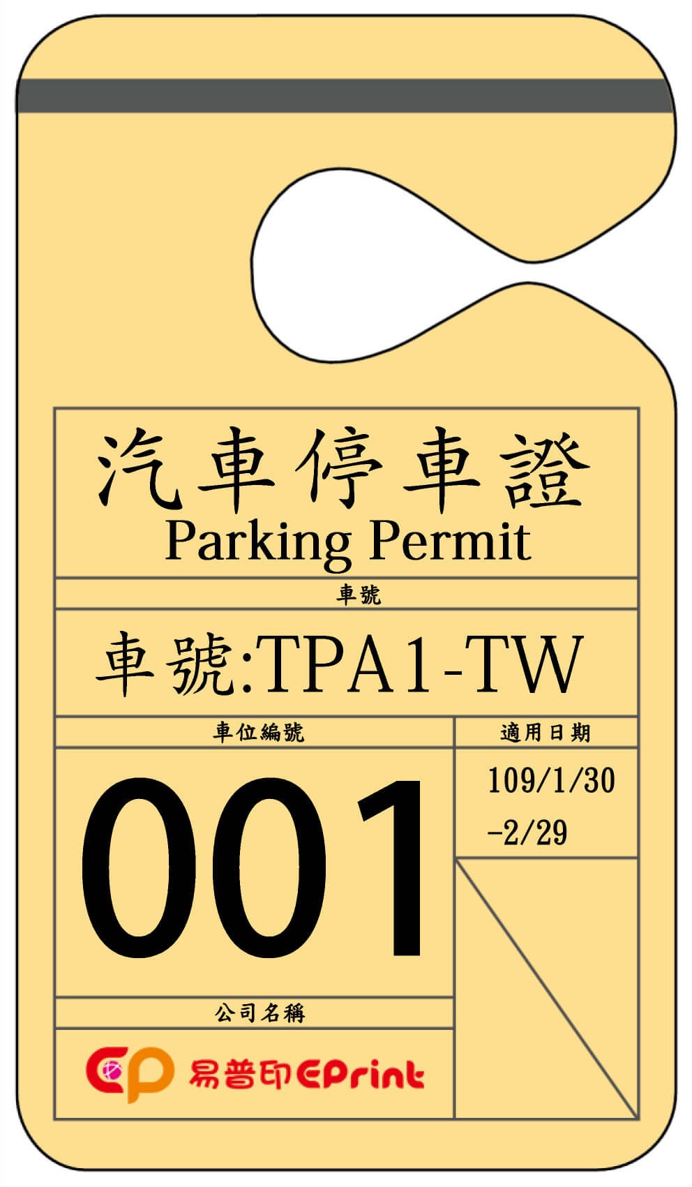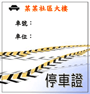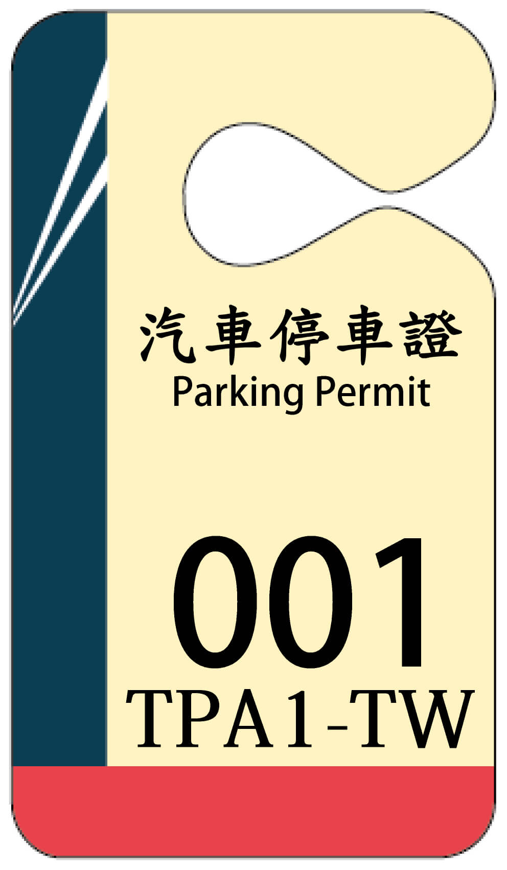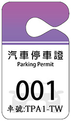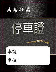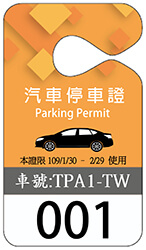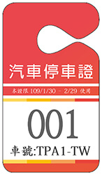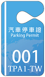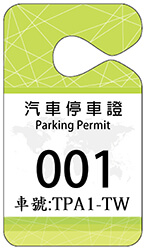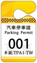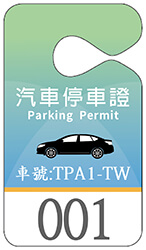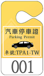 掛勾式停車證(首創) 常用尺寸:76x127 mm,採雙面彩色印刷,可將它懸掛在車內的後視鏡柱上,提供車號或車位號等資料套印服務。亦可設計為任意大小/形狀,需另外估價。