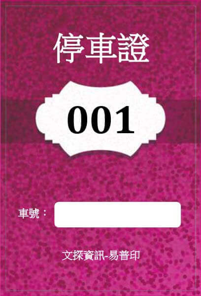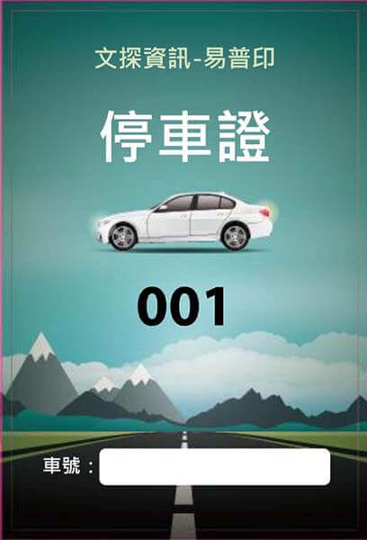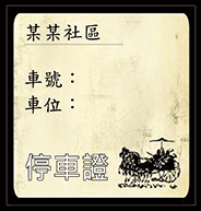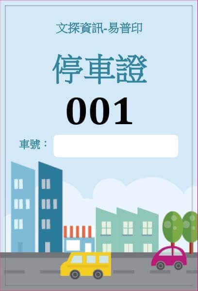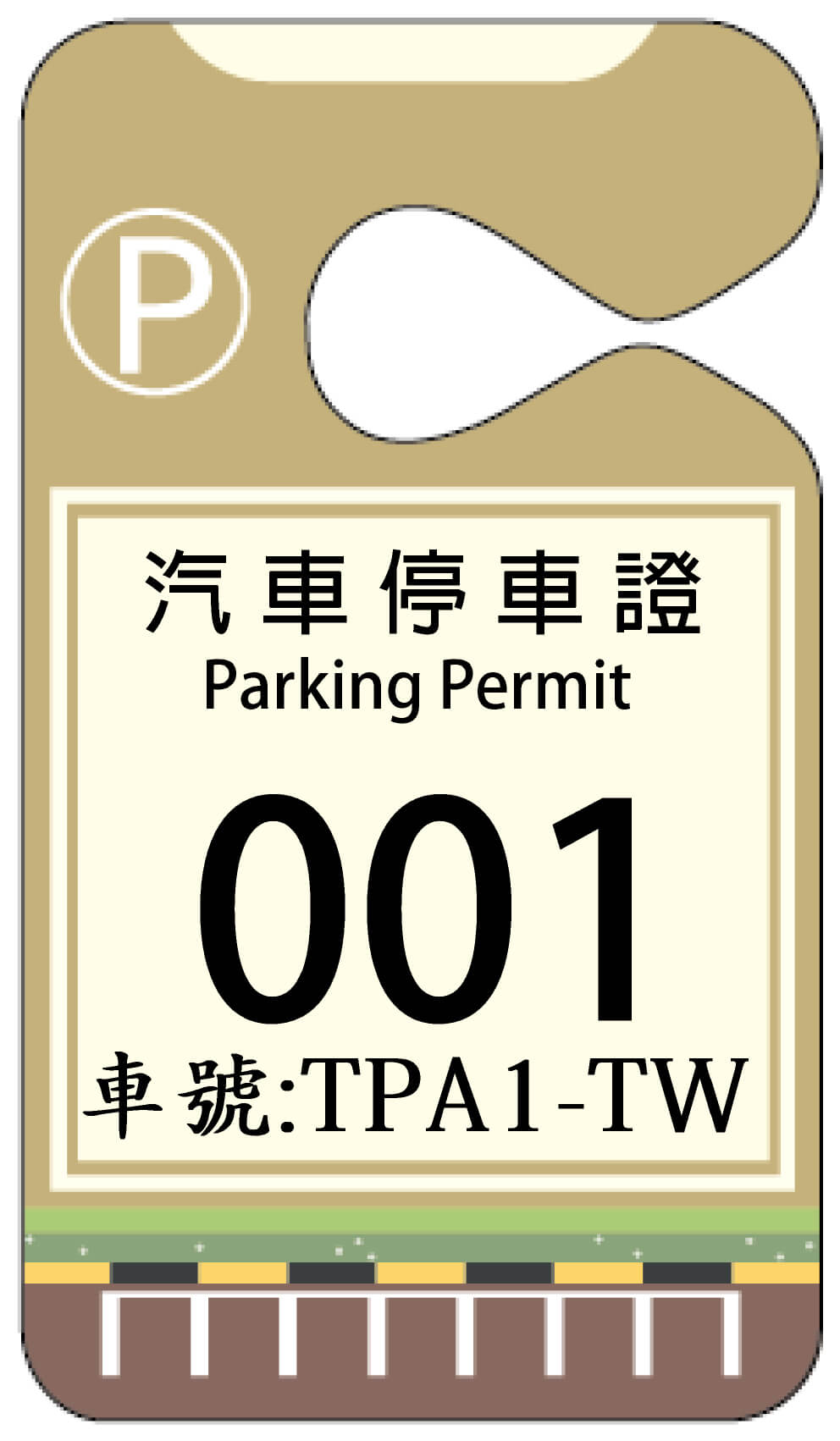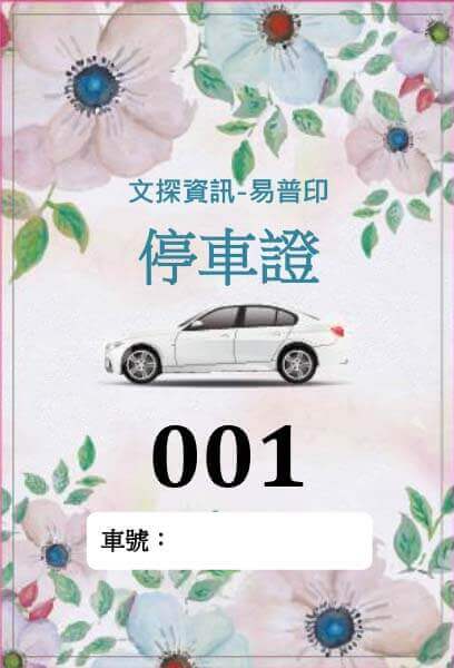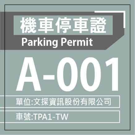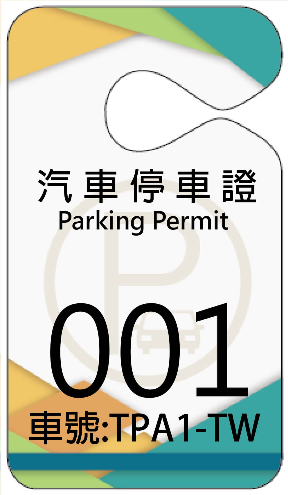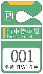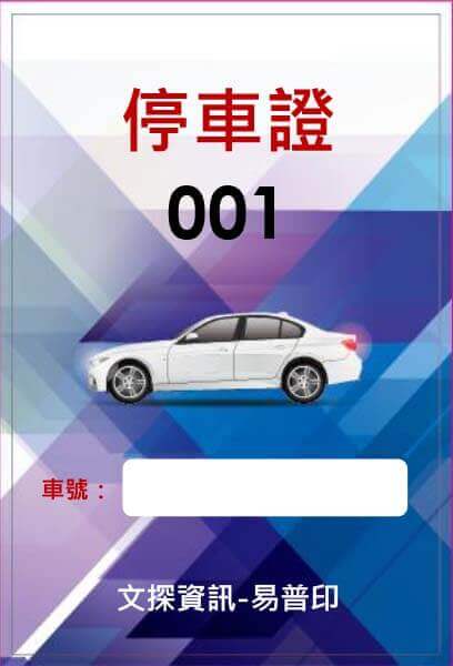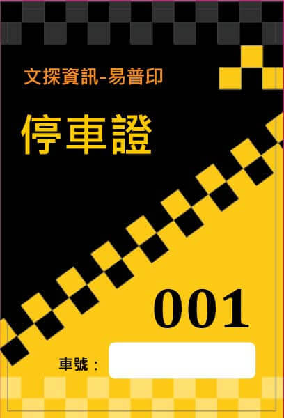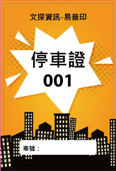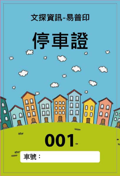 掛勾式停車證(首創) 常用尺寸:76x127 mm,採雙面彩色印刷,可將它懸掛在車內的後視鏡柱上,提供車號或車位號等資料套印服務。亦可設計為任意大小/形狀,需另外估價。