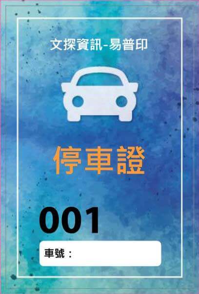 汽車停車證 長形、方形,或自行設計任意形狀。 紙質採250磅高級雪銅紙,卡片採正面四色印刷、反面黑白印刷。 可加購吸盤,或護貝加以保護。