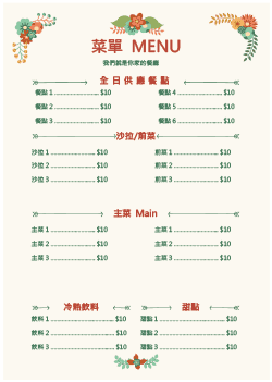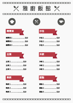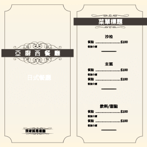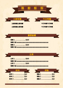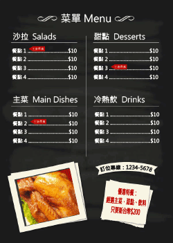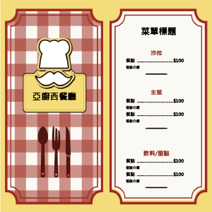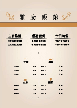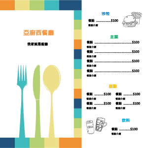 全新設計的菜單 Menu 版型,採用 Office Word (.doc) 格式,支援軟體 Office 2003 以上版本。 記得上傳 PDF 檔案,因為 Word 檔案在不同電腦會自動重排,缺字型時會自動替換,必須 PDF 檔才會正確。
